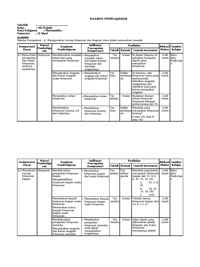 Perangkat silabus matematika k13 kelas 7 semester 1&2 edisi revisi 2020 ini kiranya dapat menjadi tambahan dan arsip dalam membuat perangkat pembelajaran. Silabus ipa smp kelas 7 semester 2 yang dilengkapi dengan pendidikan karakterfull description. Silabus bahasa indonesia kurikulum 2013 kelas 7 semester 2 download. 19 responses to materi matematika smp kelas 7 (vii) semester genap. Ii (dua) aljabar standar kompetensi : By randy ikas 324456 views. Materi matematika kelas 7 kurikulum 2013, tidak jauh berubah seperti kurikulum ktsp, pada kurikulum 2013 juga terdapat pelajaran matematika yang akan diajarkan untuk materi matematika smp kelas 7 semester 2. Silabus matematika k13 kelas v semester 2 revisi terbaru. Pp nomor 55 tahun 2021 tentang peraturan. Silabus pembelajaran matematika kls xi, semester 2. Mulai dari mempersiapkan administrasi kelas yang diperlukan dalam pembelajaran, misalnya silabus pembelajaran. Semester genap akan segera tiba, sebagai guru tentu harus segera mempersiapkan diri. Silabus matematika wajib kelas x semester genap.docx.